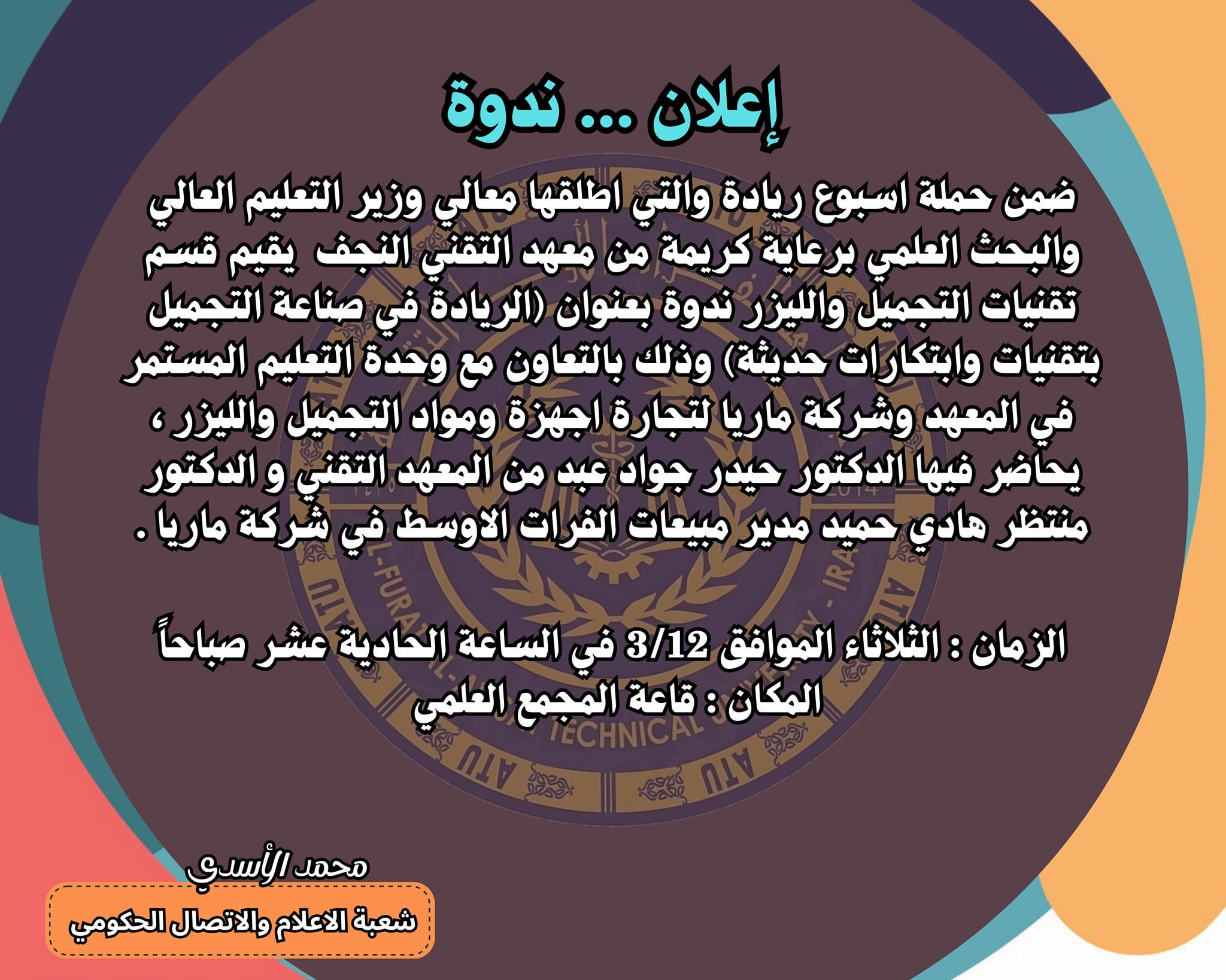 برعاية السيد عميد المعهد.. قسم تقنيات الأدلة الجنا... من مبدأ التعاون بين المؤسسات التعليم العالي ومؤسسات القطاع الخاصزار طلاب المعهد التقني النجف قسم تقنيات الأدلة الجنائية والعدلية جامعة الكفيل كلية التقنيات الط...